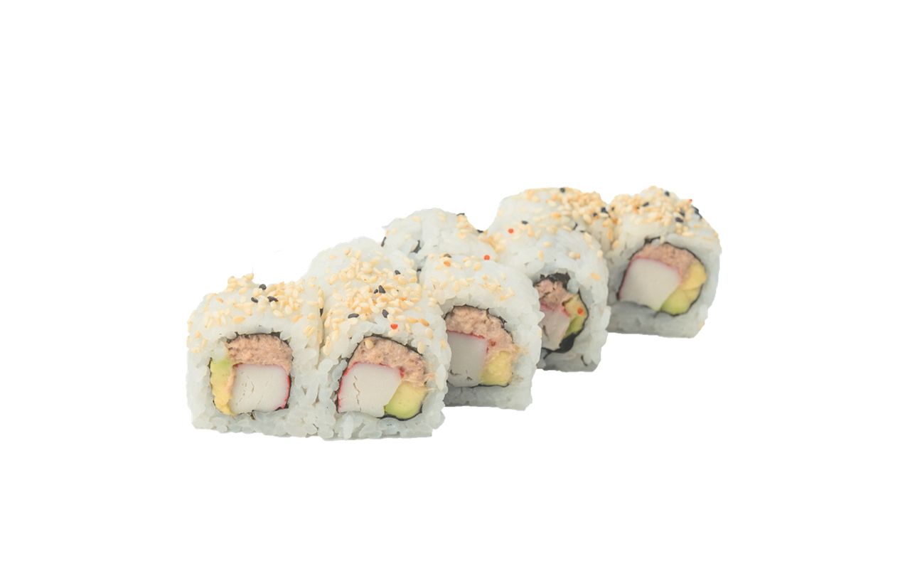 Avocado, surimi*, tonno# cotto, maionese, sesamo; (avocado, surimi*, coocked tuna#, mayonnaise, sesame).