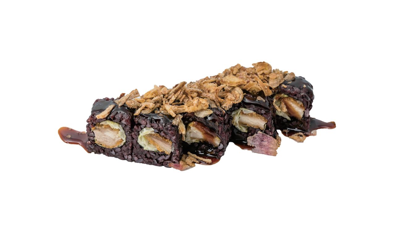 Riso venere, pollo fritto, cipolla fritta, salsa teriyaki, maionese; (venus rice, fried chicken, fried onion, teriyaki sauce, mayonnaise).