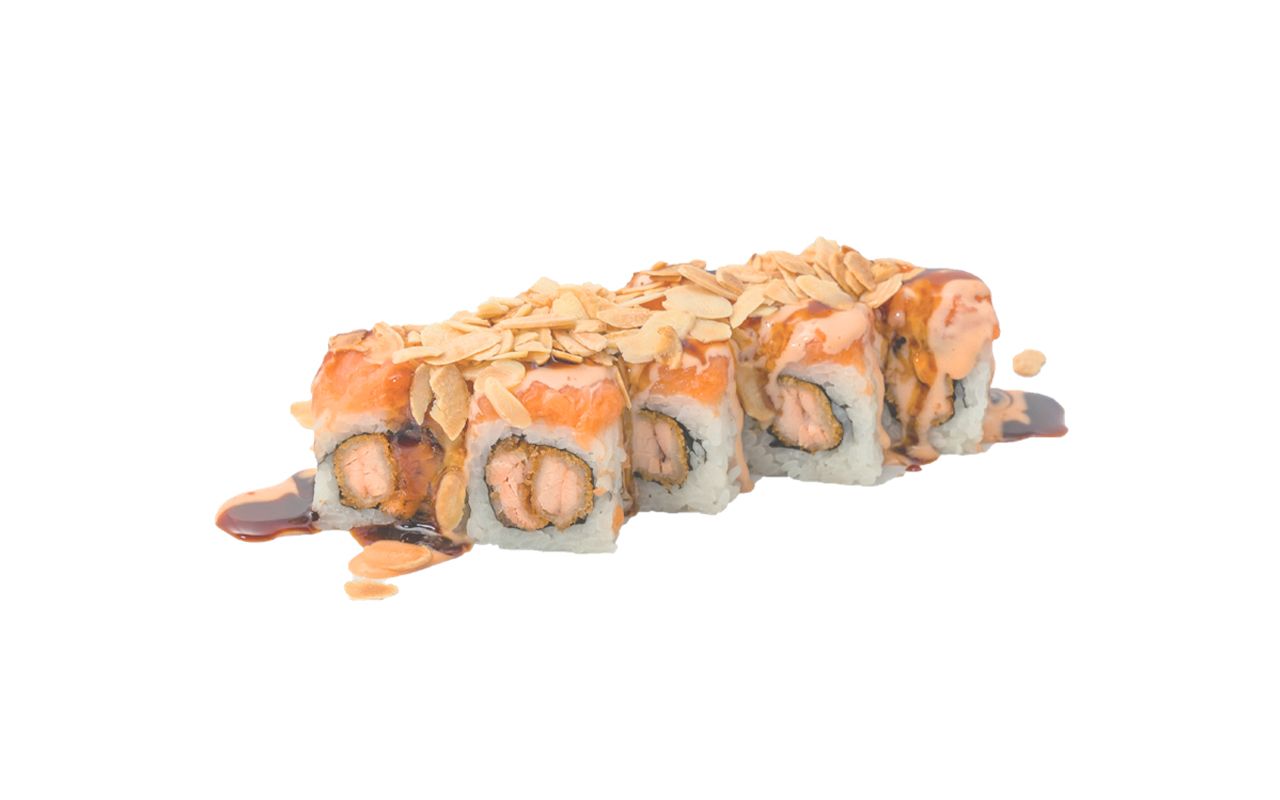 Salmone# fritto, tartare di salmone#, mandorle, salsa piccante; (fried salmon#, salmon# tartare, almonds, spicy sauce).
