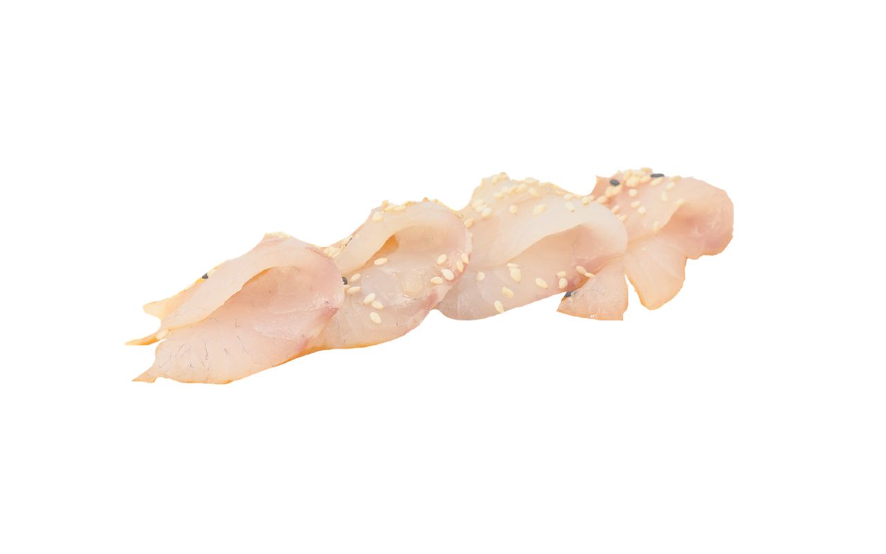 Branzino#, sesamo, salsa ponzu; (seabass#, sesame, ponzu sauce).