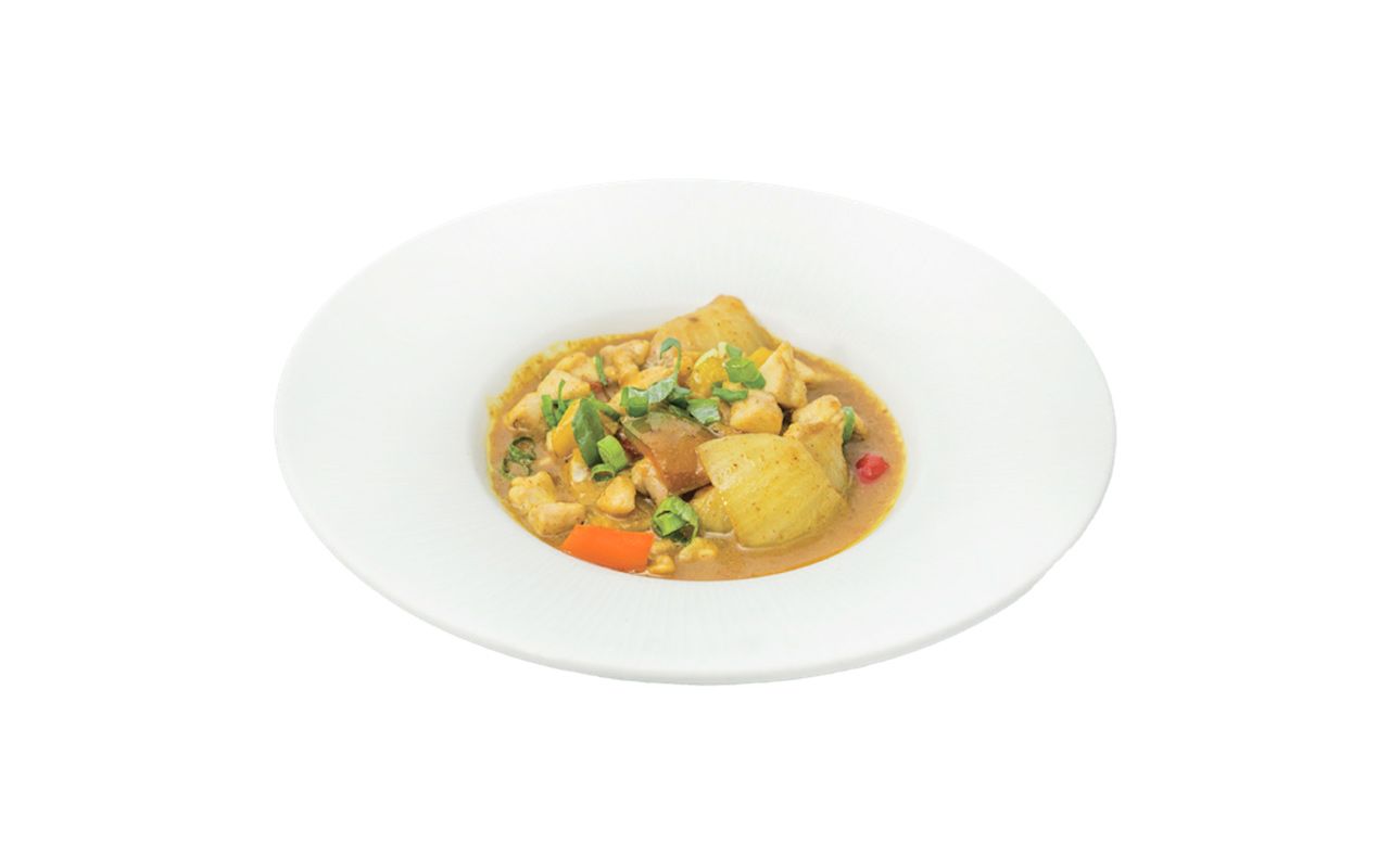 Pollo saltato con peperone, cipolla, salsa curry; (chicken sautèed with pepper, onion, curry sauce).