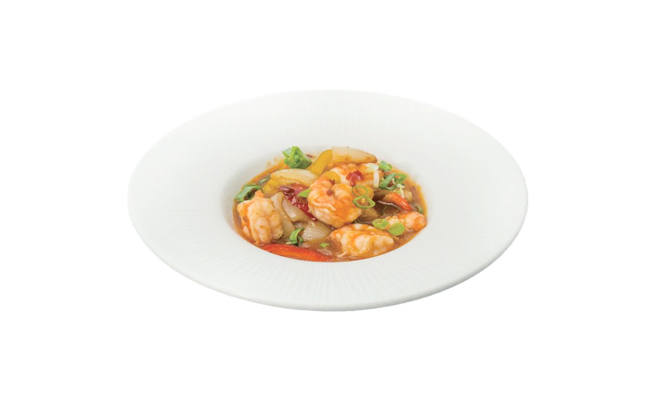 Gamberi* saltati con verdure, salsa piccante; (sauteed shrimps*, with vegetables, spicy sauce).
