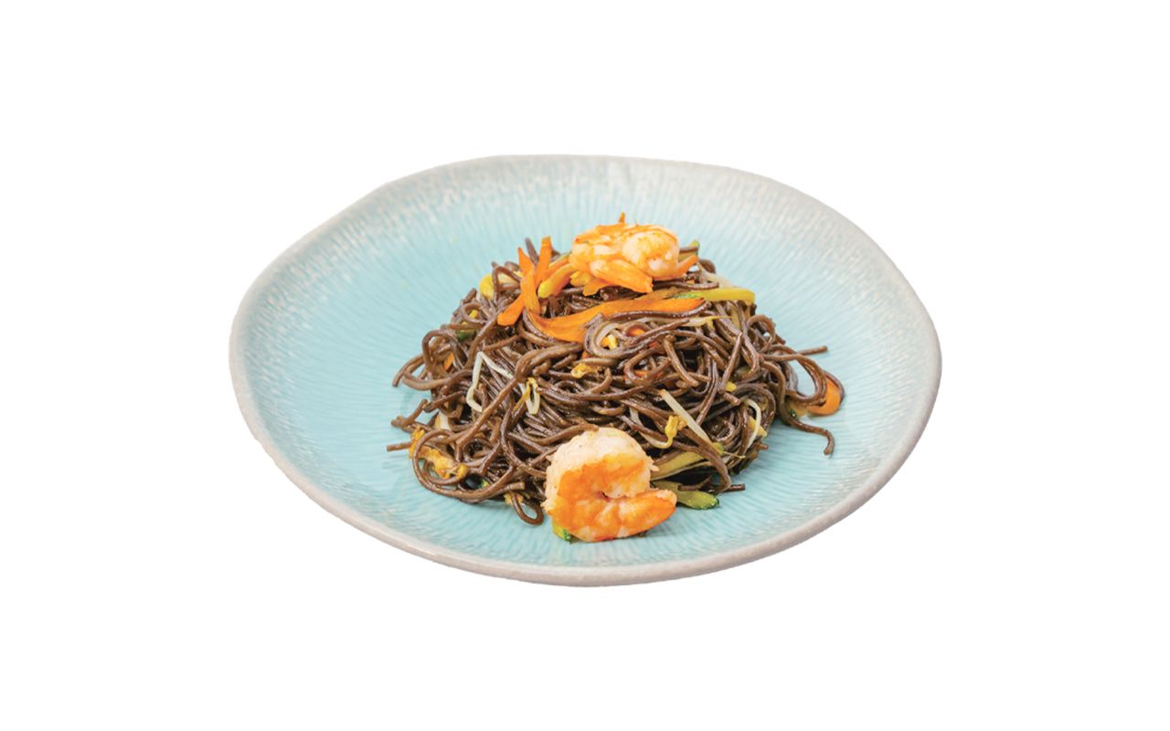 Spaghetti di grano saraceno con gamberi*, verdure ed uova; (buckwheat noodles with shrimp*, vegetables and eggs).