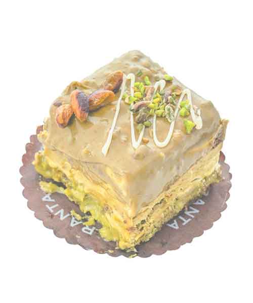 Pan di spagna al cioccolato, croccante di pistacchio, semifreddo di pistacchio, semifreddo al cioccolato bianco, chicchi di pistacchio e glassa al pistacchio.