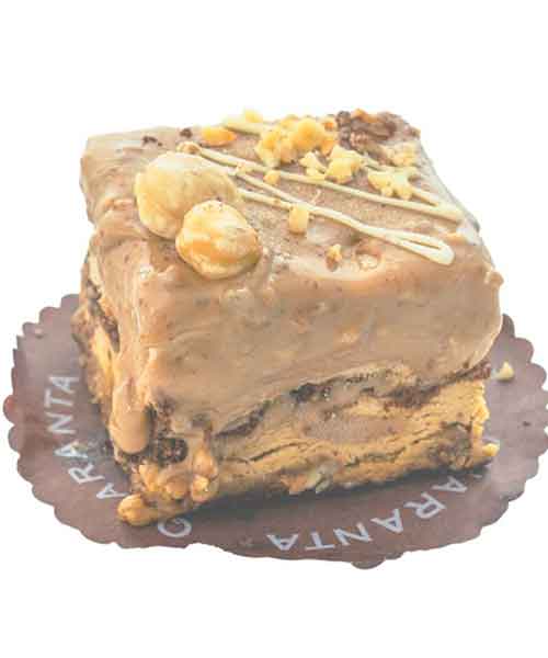 Pan di spagna croccante di nocciola, semifreddo caffè, semifreddo alla nocciola e glassa alla nocciola.