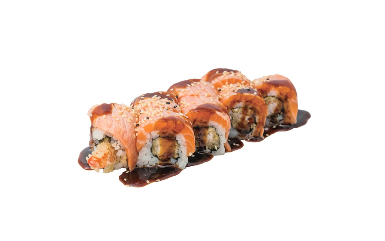 Tempura di gamberi*, philadelphia, salmone# flambè, salsa teriyaki, maionese; (shrimp* tempura, philadelphia, salmon# flambé, teriyaki sauce, mayonnaise).