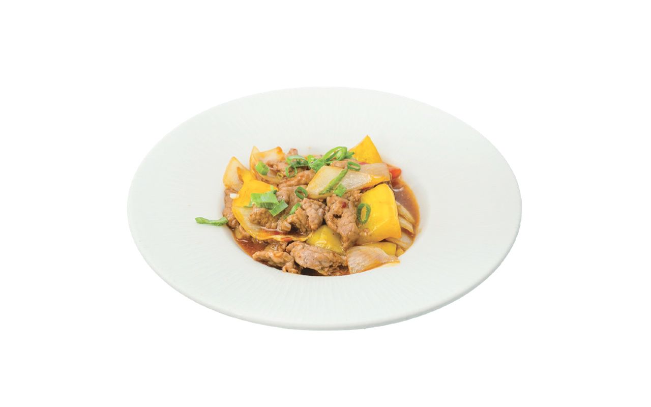 Manzo saltato con verdure, salsa spicy; (beef sautéed with vegetables, spicy sauce).