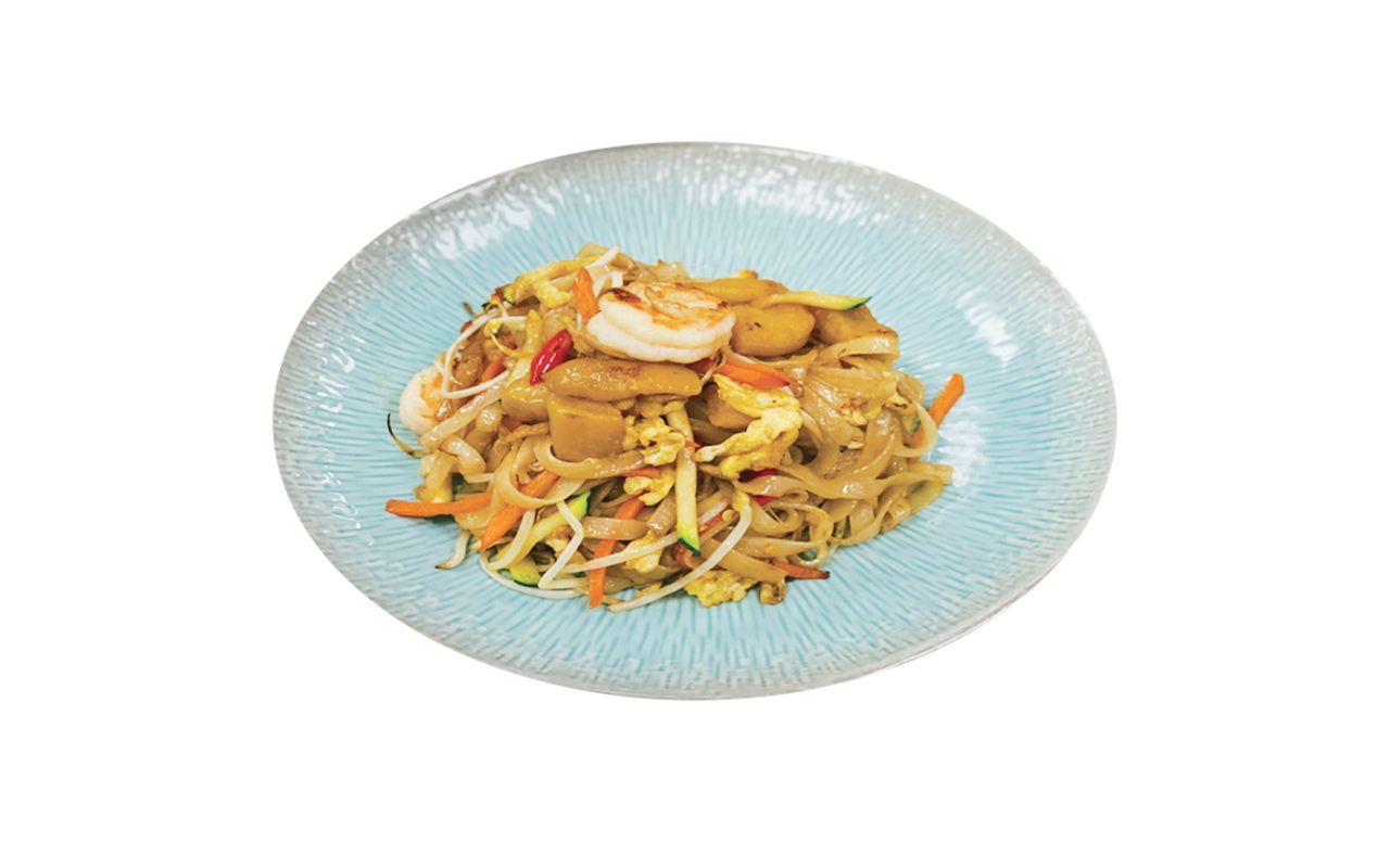 Tagliatelle di riso saltate con gamberi*, verdure, rapa, uova, arachidi; (rice tagliatelle with shrimps*, vegetables, turnip, eggs, penuts).